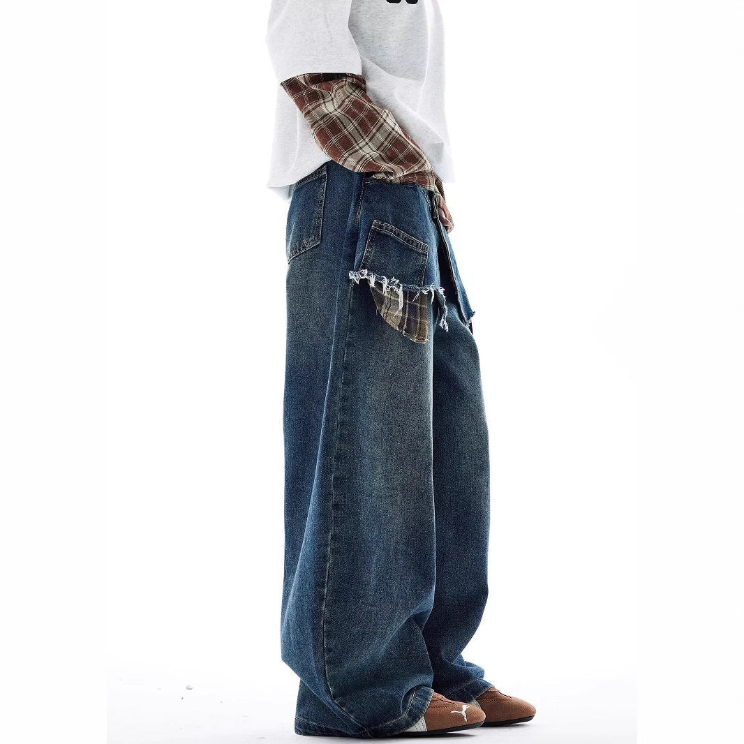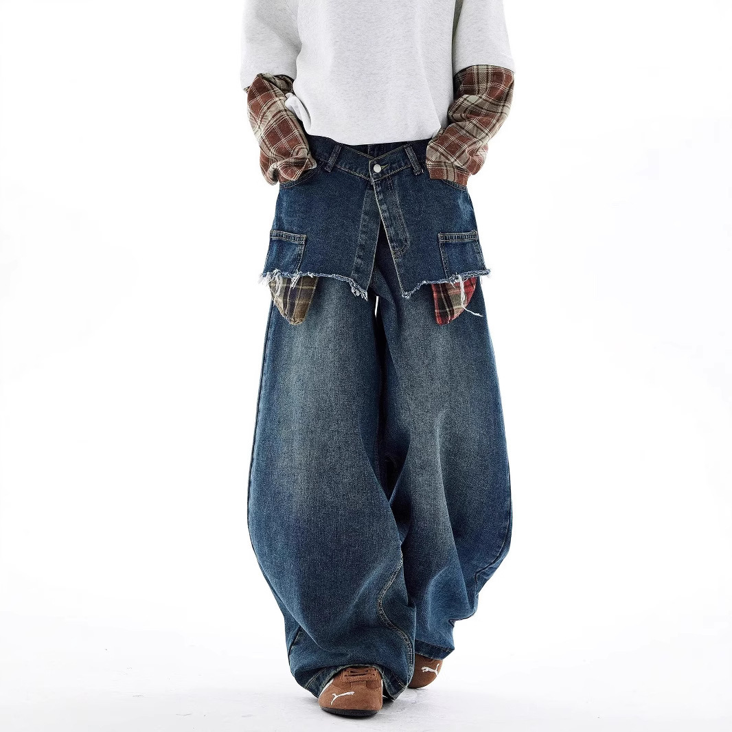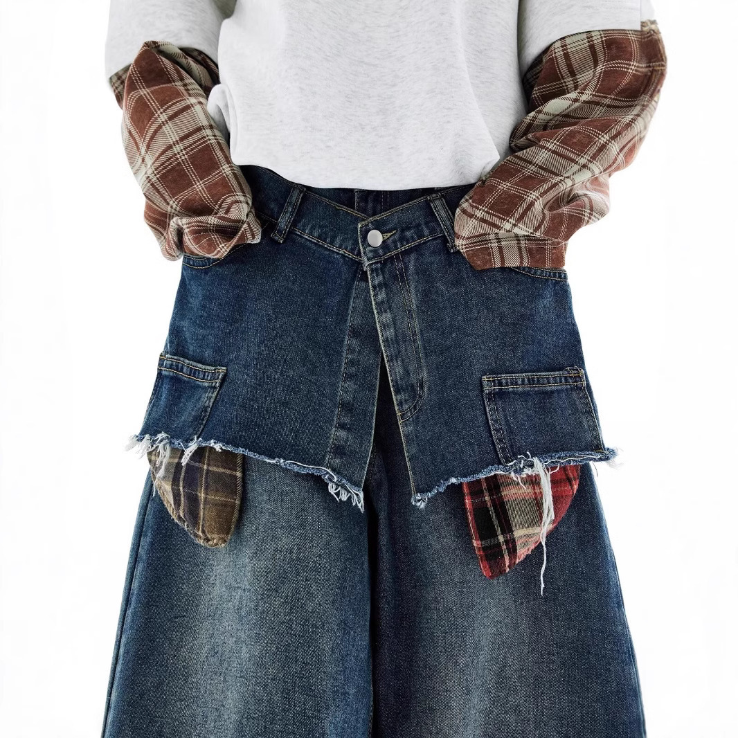 American-style Retro Faux Two-piece Plaid Patchwork Jeans