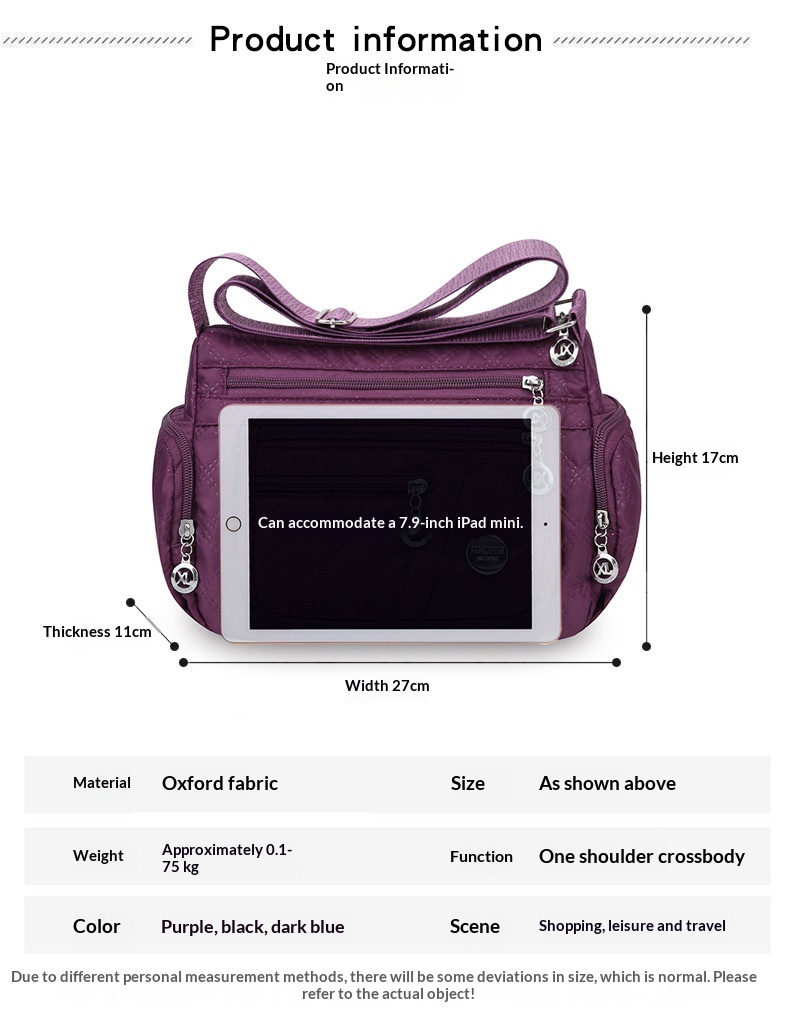 Product information: Lining material: polyester Applicable scene: everyday wear Colors: black, purple, dark blue Outer pocket type: inner patch pocket Hardness: medium-soft Material: Oxford cloth Bag shape: horizontal square Internal bag structure: ID card pocket Trendy elements: diamond pattern, other Style: urban minimalist Shoulder strap quantity: single strap With or without compartments: no compartments